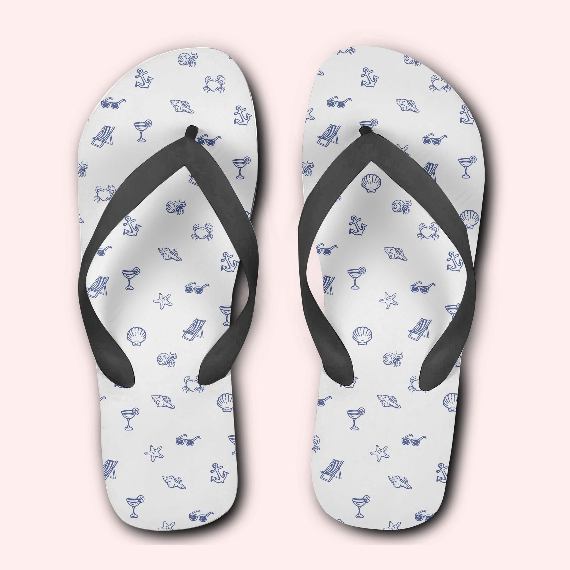 Step into summer with these stylish coastal-themed flip flops, perfect for beach lovers and vacation vibes. Featuring a crisp white background adorned with charming nautical and coastal icons in blue—anchors, seashells, crabs, sunglasses, and more—these flip flops capture the essence of island life. The icons add a touch of coastal charm, making them a great souvenir or everyday essential for seaside adventures.