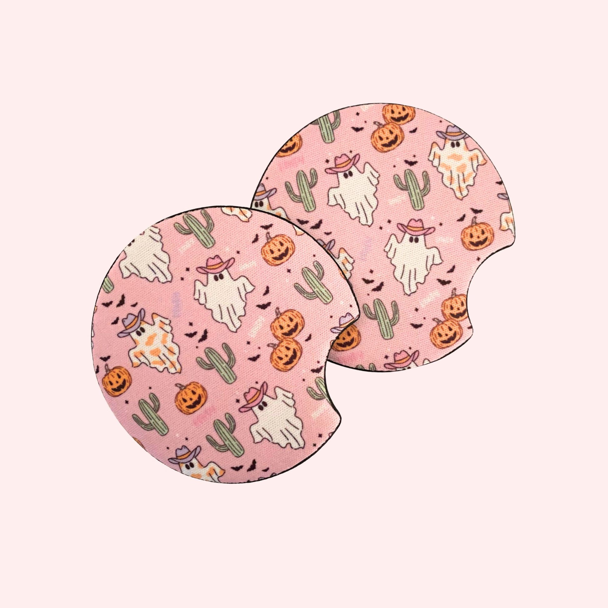 Creep it real tidy with these cowboy ghost coasters. A must have for your on-the-go pumpkin spice lattes. Features a pink background with cacti, pumpkins and cowboy ghosts.
