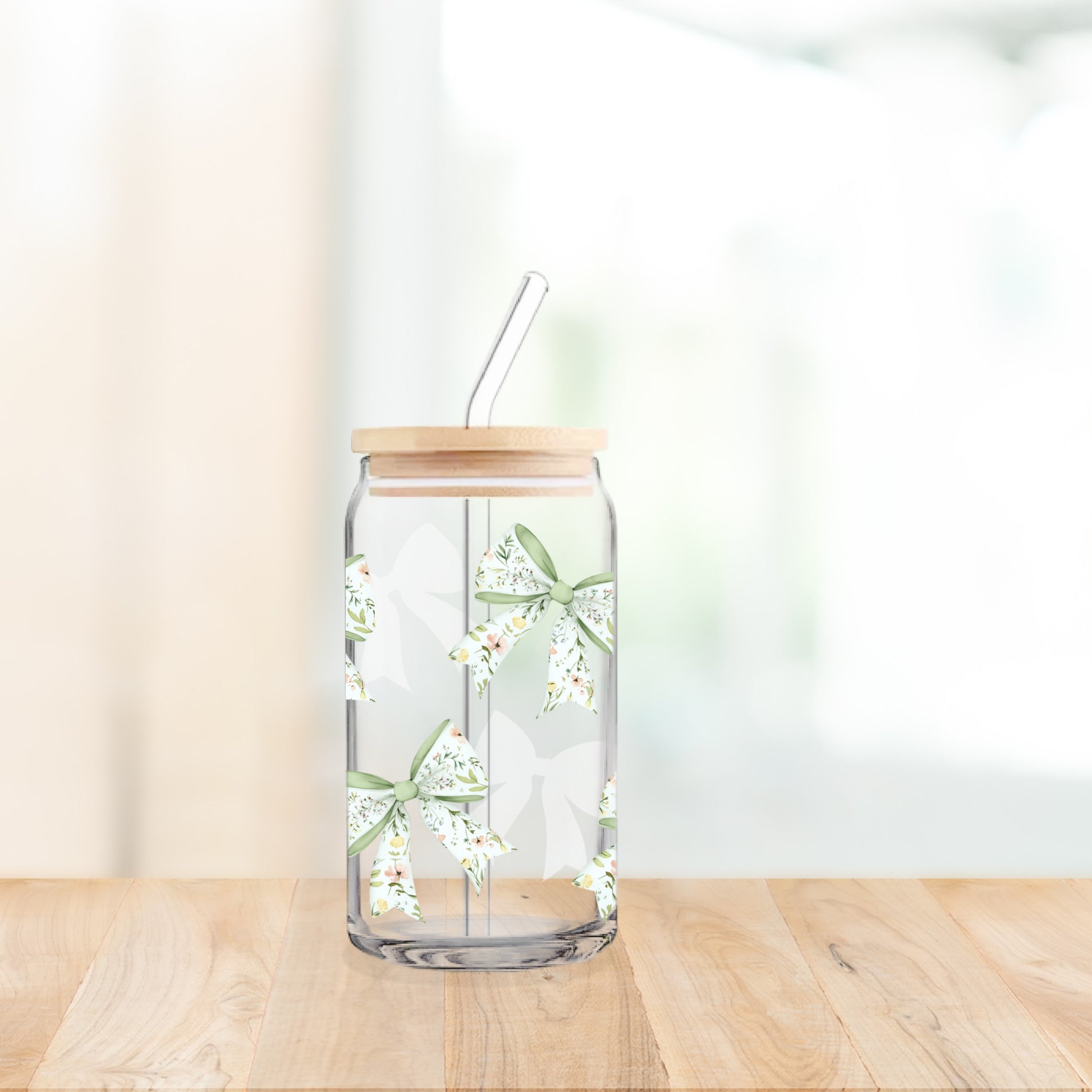 Step into Spring with this gorgeous floral bow glass tumbler. The elegant pastel green bows with floral details make this tumbler a chic accessory.