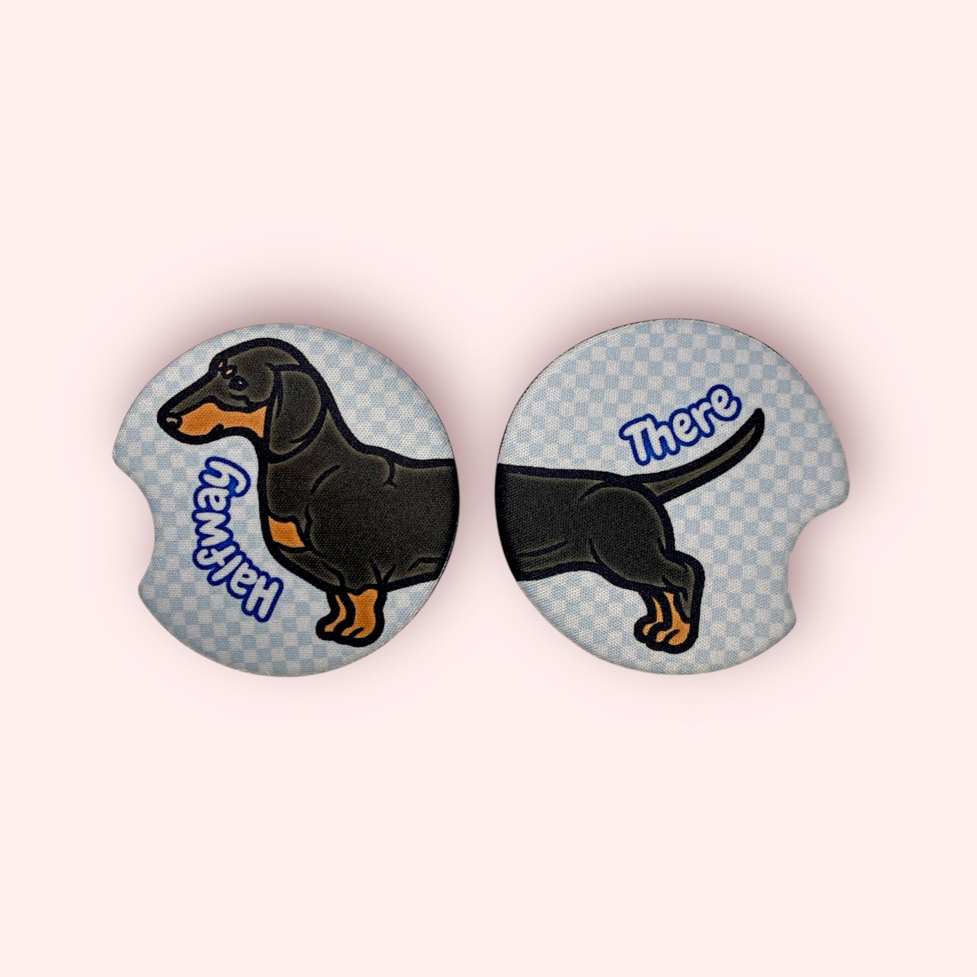 Add a dash of humor and personality to your ride with these adorable Dachshund car coasters! Featuring a playful, cartoon-style dachshund stretched across two coasters, the design cheekily reads "Halfway There" — perfectly capturing the spirit of every journey.