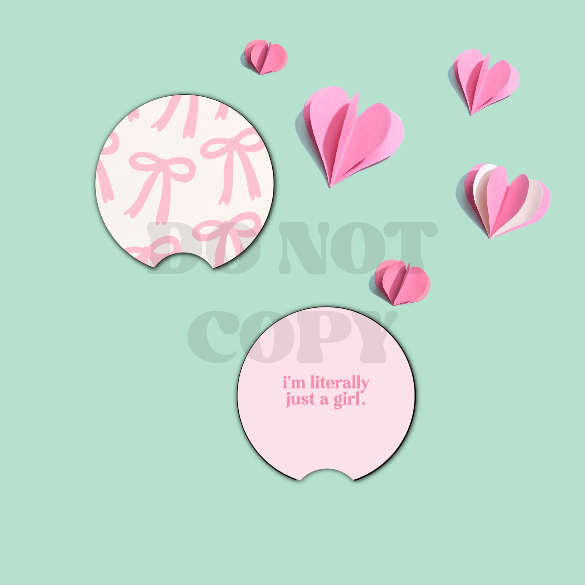 Add a touch of charm to your car with these stylish and practical neoprene car coasters! This set includes two adorable designs: one featuring a dainty pink bow pattern and the other with the playful phrase, "I'm literally just a girl." in a soft pink hue.