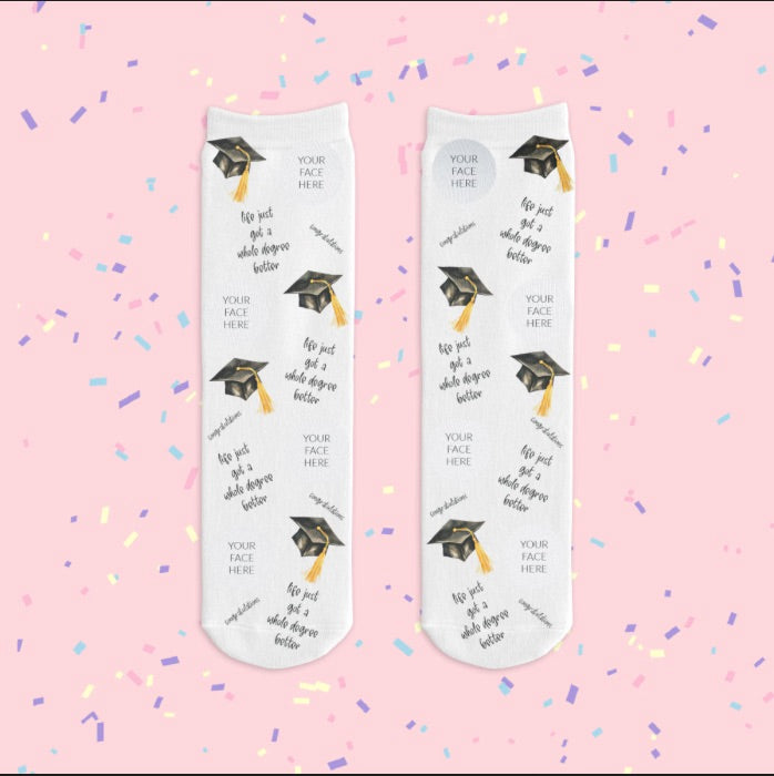 Celebrate a loved ones milestone in style with our graduation socks! These custom socks are the perfect way to commemorate an achievement and add a unique touch to a special day. Each pair are crafted from comfortable material and can be customised with a face. Whether you're wearing them under your cap and gown or giving them as a thoughtful gift to a loved one, these socks will keep your feet cozy while reminding your of your hard-earned success. Order your personalised graduation socks today and step into the future with pride!